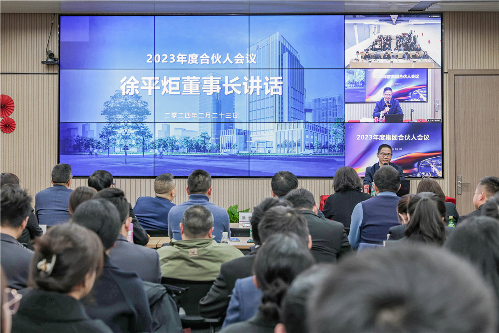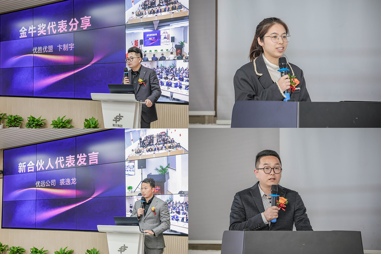 會議進行了新入合伙人簽約儀式。王淑樂、孫榕、謝智娟、方慧芳、金曉霞、李培斯、黃偉堒、劉鋒、裘逸龍、胡勇奇、劉慧兒、倪浩、金繼紅、張水清、鐘笑寒、雷雁、汪宏偉、劉艷、王正強等19位骨干同事成為新合伙人。徐平炬董事長和錢天鋒聯席總裁分別與新合伙人簽約。優遠公司裘逸龍和優達公司張水清代表新合伙人分別發言。裘逸龍回顧了職業發展歷程,他表示部門業績持續增長,得益于集團平臺資源支持、公司機制助力以及業務團隊凝心聚力。優達公司張水清結合本人工作感悟和跟單部門工作實際,聚焦大客戶跟單流程與關鍵節點,跟單人員績效考核方式等方面進行了重點展示說明。