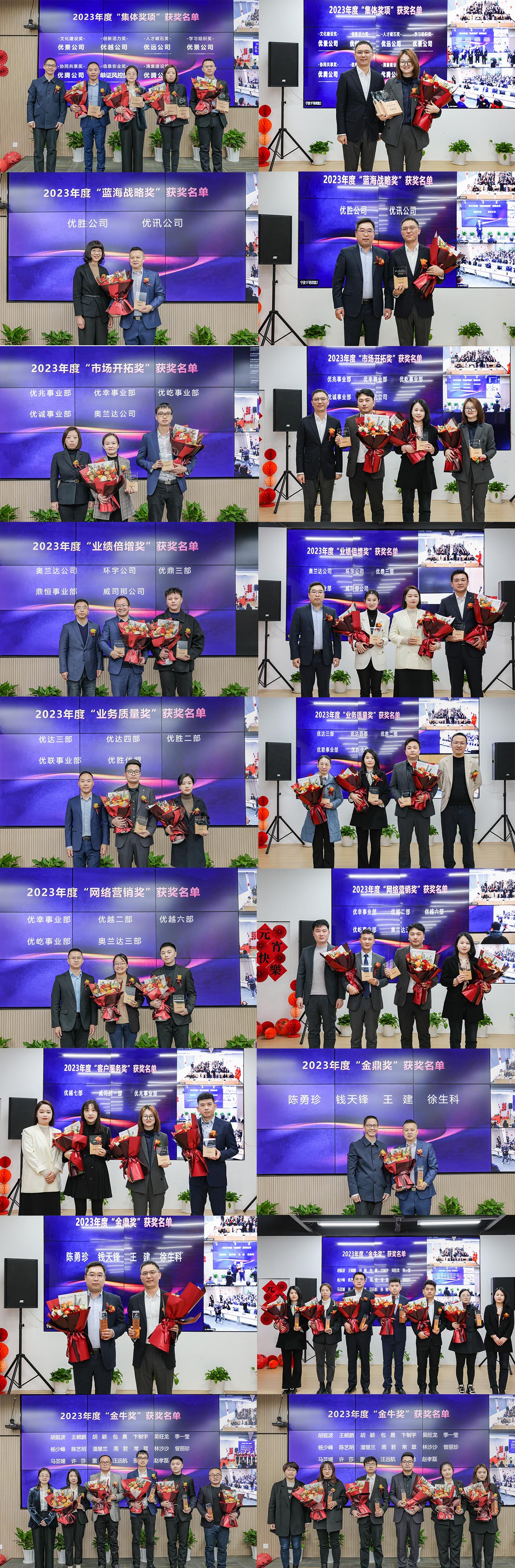 會議舉行年度重要獎項頒獎儀式。23年度集團設立集體獎項7個,優景公司榮獲文化建設獎和學習組織獎,優騰公司榮獲協同共享獎和清廉建設獎,優越公司榮獲創新活力獎,優遠公司榮獲人才磁石獎,集團單證風控部榮獲信息安全獎。23年集團設立團隊獎項6個,分別是藍海戰略獎、市場開拓獎、業績倍增獎、業務質量獎、網絡營銷獎和客戶服務獎,共有21個業務團隊獲得獎項榮譽。藍海戰略獎由優勝公司和優訊公司獲得,該獎項要求對新業態模式敏感,業務布局前瞻性強,有示范性新項目落地成功,公司業務布局成為集團重要業務賽道之一,陳勇珍和錢天鋒分別代表各自公司領取藍海戰略獎,所獲榮譽實至名歸。23年度陳勇珍、錢天鋒、王建、徐生科等四位業務總經理獲得個人獎項的最高榮譽金鼎獎,該獎項歷來以競爭激烈著稱,四位獲獎者憑借著業務規模、高速增長和盈利能力摘得金鼎桂冠。2023年度共有20位業務負責人憑借部門優秀業績,榮獲個人金牛獎項并現場上臺領獎。