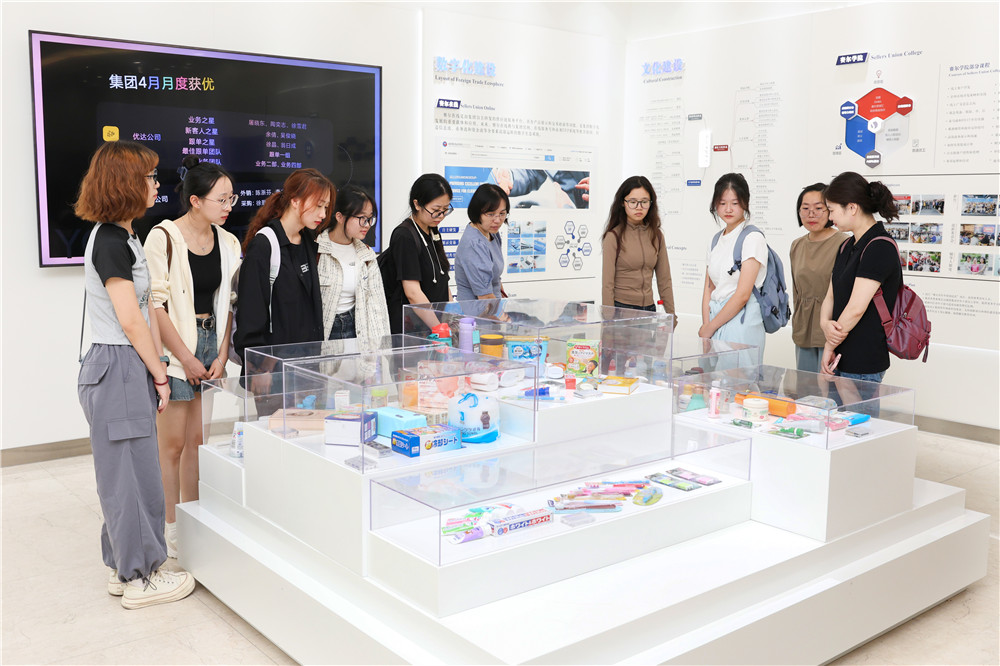 近期,集團多所合作高校校企開放日活動如期而至。6月19日和6月21日,南昌工程學院和浙江財經大學2025屆優秀應屆生同學和老師參訪義烏運營中心。走進一樓大廳,同學們就被公司的文化展廳吸引,人資部招聘組HR小伙伴為大家一一介紹了集團發展歷程、經營機制、人才培養體系、公司文化及各類興趣社團、公益活動等。文化墻上,集團的全球市場圖和與各國客人的交談合影照片令人眼前一亮,老師和同學們紛紛詢問了解外貿拓客的方式、對語言能力的要求等,對外貿表現出了極大興趣。