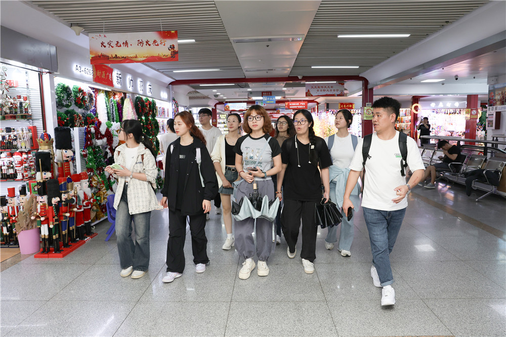 短暫休息片刻后出發世界最大的小商品城——義烏國際商貿城,集團帶領同學和老師們主要參觀了商貿城一區和二區。在逛店鋪的同時,講解人深入介紹了各產品的主要出口國、各國客人對產品的喜愛偏好等。現場還針對現場同學們關于出口貨物體積計算單位等方面的疑問一一解答,讓同學們零距離感知外貿工作氛圍。
