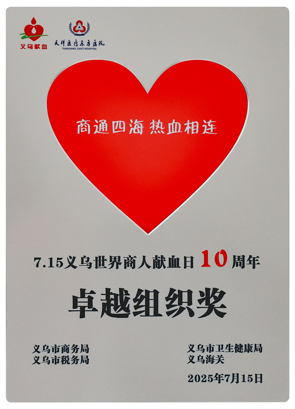 7月15日上午,“商通四海 熱血相連”第十屆7?15義烏世界商人獻血日主會場活動在天祥東方醫院隆重舉行。本屆活動由義烏市商務局、衛健局、稅務局、海關等單位聯合主辦,30余家中外商人團體攜手承辦。作為義烏市外貿出口領軍企業,賽爾集團受邀出席本次十周年活動,集團綜合行政部總監龔江民、各公司和職能部門的15名代表共同參加。